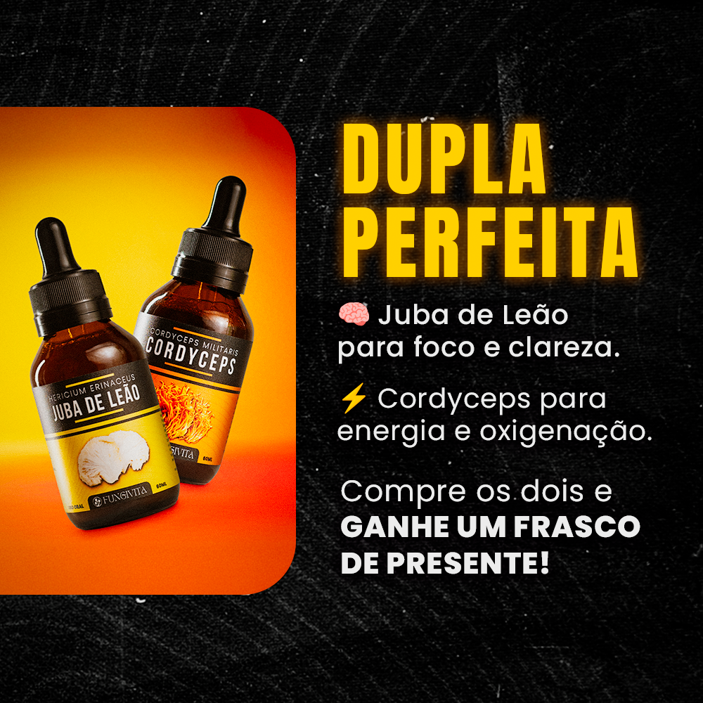 Na compra da Dupla Perfeita (Juba de Leão + Cordyceps) por R$270, você ganha um terceiro frasco como presente. É o momento ideal pra experimentar os efeitos dessa combinação com mais rendimento, mais foco e mais energia, por muito mais tempo.
