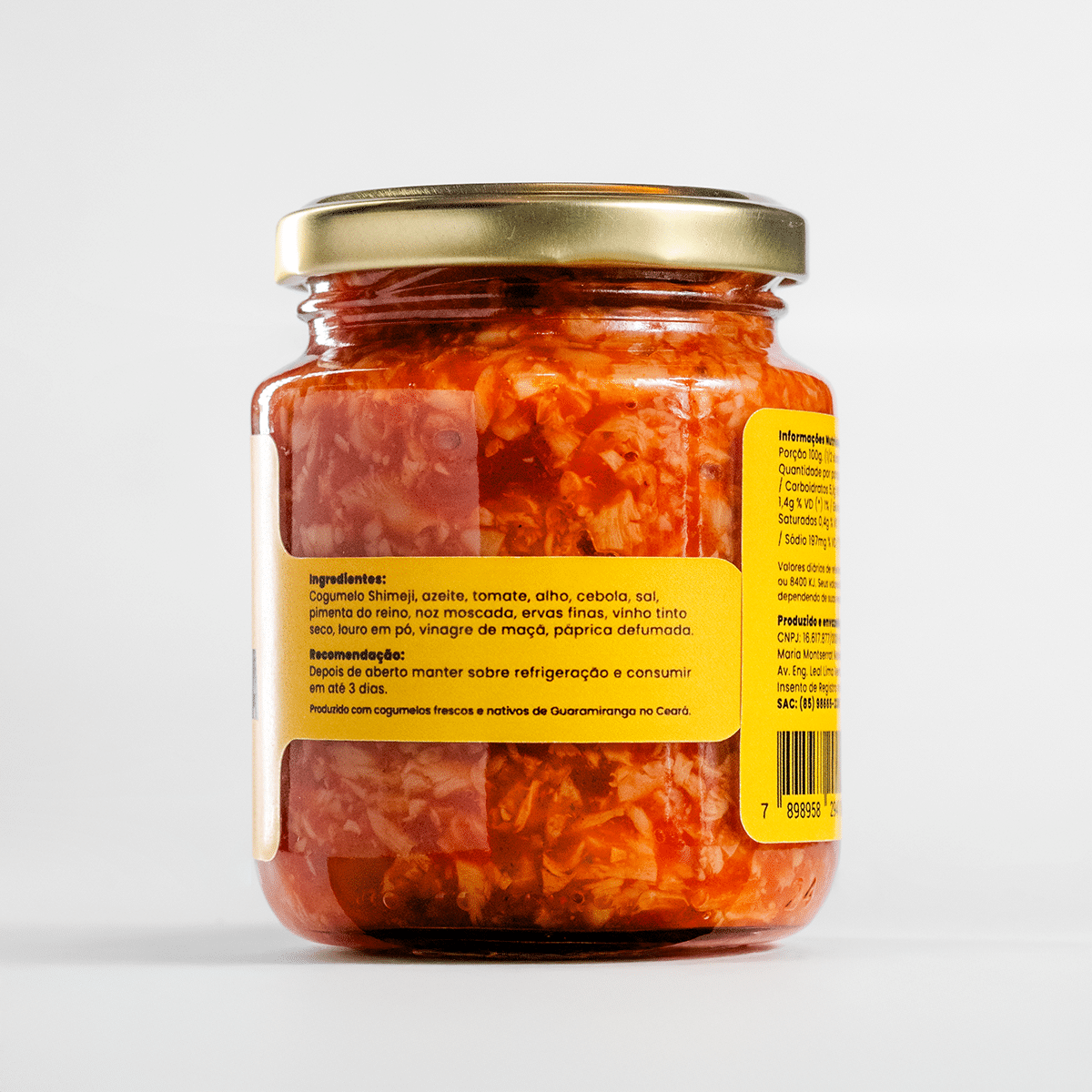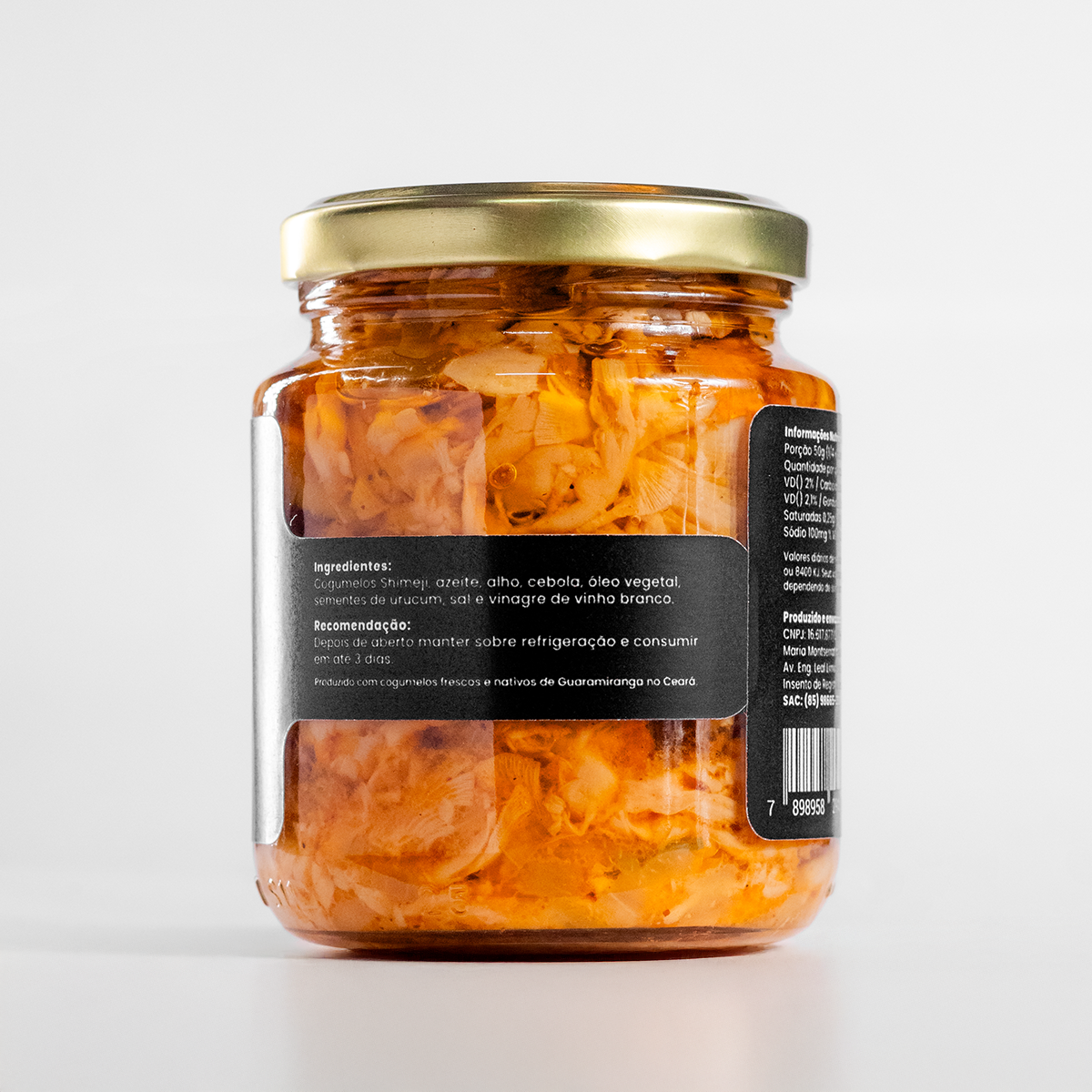 Ingredientes (Salteado): Cogumelo Shimeji, azeite, cebola, óleo vegetal, sementes de urucum, sal e vinagre de vinho branco.